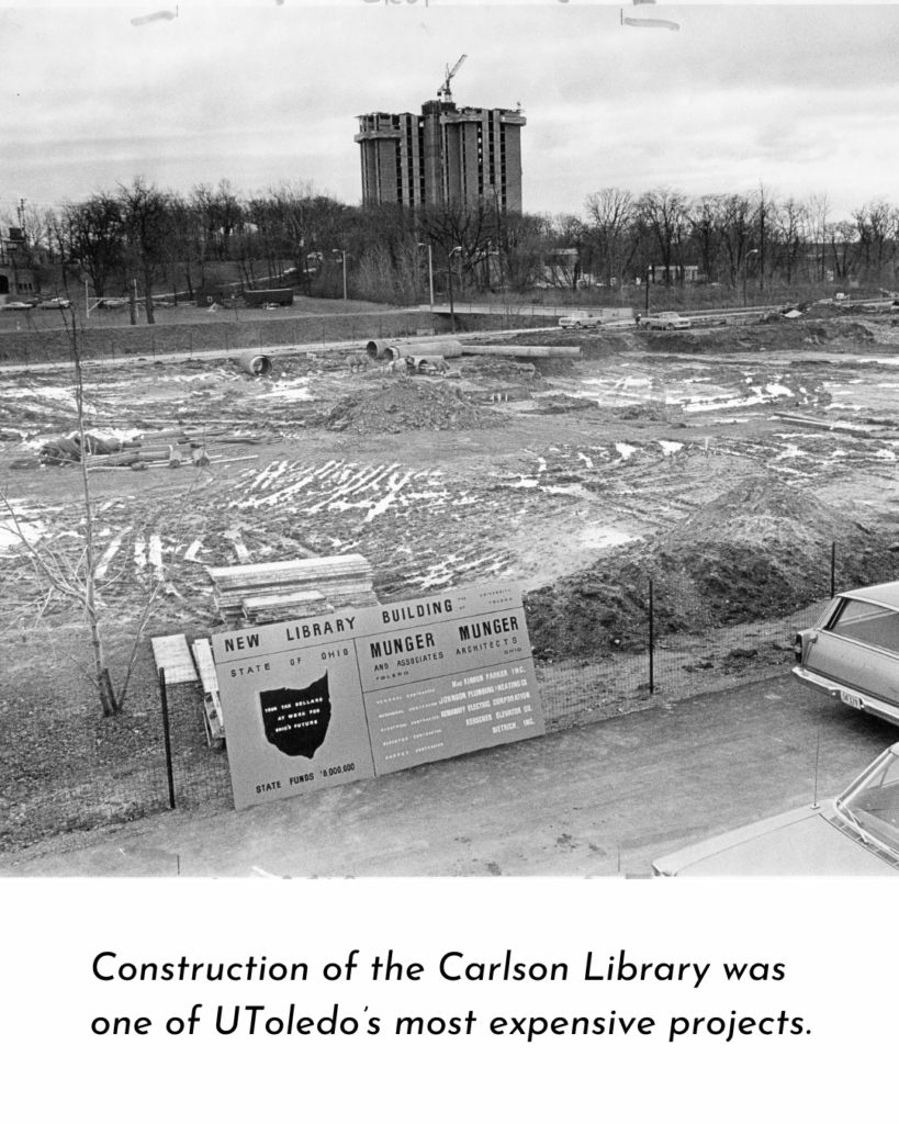 Groundbreaking of the new library occurred in December 1970 and cost $7 million dollars, the most expensive project the University of Toledo had funded up to that point. It officially opened in April 1973 and was named after William S. Carlson, the president who initiated the idea for the new building and who was one of the longest serving presidents in the University’s history. At the time of its construction, it was one of the largest libraries among state schools. Today, the Carlson Library features over half a million physical books, electronic book collections, academic support services, study environments and more across its six floors.
